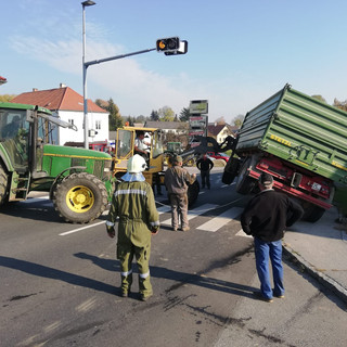 Bei einem mit 2 Anhängern gezogenen Traktor kippte der erste Anhänger um und stürzte so gegen eine Straßenlaterne sowie an das angrenzende Gebäude.